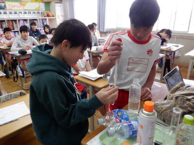 5年生の理科では、「もののとけ方」の学習を進めています。 まずは、正しい量を測るためにメスシリンダーのメモリの読み方から学習をスタート。 実験が始まると、50mlの水に食塩を1杯、2杯、3杯…と入れていき、 自分の手で確かめることで、教科書だけでは味わえない“発見の喜び”が子どもたちの表情に広がっていきます。 |