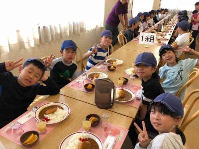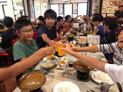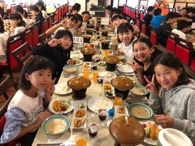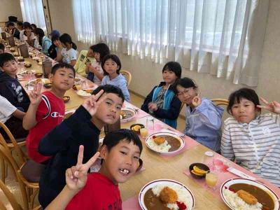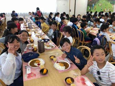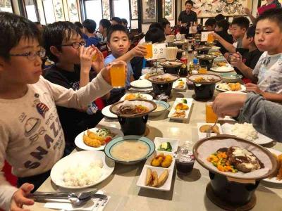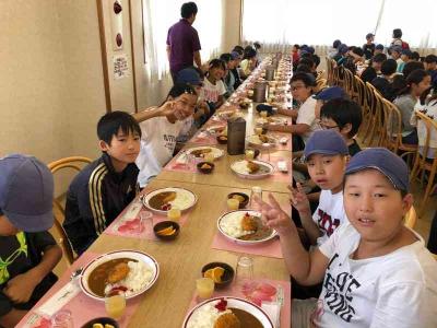 ハイキングの疲れもなんのその。子供たちは元気にご飯を食べてます。ジュースで乾杯をしている子供たちもいました。
