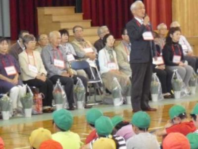 100名を超える学校応援団の中から、32名の地域の皆様が参加してくださいました。集会は、学校応援団の皆様とハイタッチをしながらの入場でスタートしました。児童会長の感謝の言葉、校歌やカーネーションの鉢花をプレゼントして感謝の気持ちを伝えることができました。