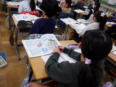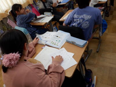 | ひばり学級の算数では、プリントやドリルを使って学習に取り組みました。子どもたち一人ひとりに合った内容で進めているため、難しい計算に挑戦する子もいれば、学期末ということで「力だめし」のページに取り組む子もいました。 「47×5×2」といった複雑な計算に真剣な表情で取り組む姿や、力だめし問題に挑戦する姿から、子どもたちの集中力と成長が感じられました。計算が終わるとすぐに担任の先生に丸付けをしてもらい、正解すると嬉しそうに笑顔を見せる場面もありました。 |
