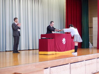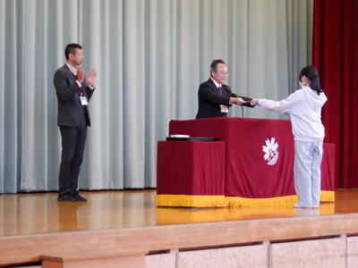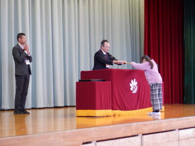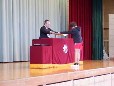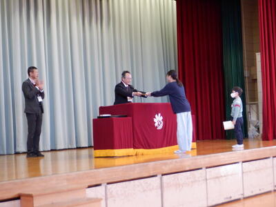 | 本日、全校で表彰朝会を行いました。 夏休みの宿題として提出された作品の表彰や、市内音楽会や地区音楽会に出場した5年生のクラスの表彰など、たくさんの子どもたちが舞台に立ちました。 一人ひとりに賞状が渡されるたびに、会場からは温かな眼差しと惜しみない拍手が送られました。子どもたちの努力と成果をみんなで喜び合う時間となりました。賞状の枚数以上に、日々の頑張りや挑戦の積み重ねが感じられる、素晴らしい表彰朝会でした。 |