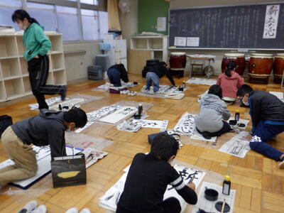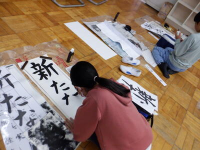 | 本日の5年生の書写の時間では、毎年恒例の「書き初め」を行いました。多目的室に移動し、今年の文字「新たな心」に挑戦しました。 子どもたちは一筆一筆に気持ちを込め、真剣かつ丁寧に取り組みました。力強く堂々と書き上げる子もいれば、繊細で美しい線を大切にする子もいて、同じ文字でありながら一人ひとりの個性が際立つ作品となりました。 |