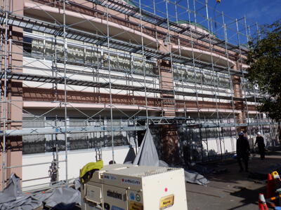 | 本日(12月9日・火曜日)、本校外装工事に使用していた足場の一部が外され、新しく塗装された校舎の姿が見られるようになりました。 校舎全体は、子どもたちの気持ちを明るくしてくれるようなピンク色(旧常光小カラー)に包まれ、校章のある部分は目に優しい濃いグリーン(旧笠原小カラー)で包まれています。中央小カラーである赤も目立つ位置に配置され、新しい色彩に彩られた校舎は、まるで生まれ変わったような印象を与えてくれます。また仮囲いが外れることで教室内も太陽の明るい光が差し込んでいます。 下校時にこの姿を目にした子どもたちは、きっと胸を弾ませ、感動を覚えることでしょう。新しい校舎とともに、これからの学校生活もさらに楽しく、豊かなものになっていくことを願っています。 |