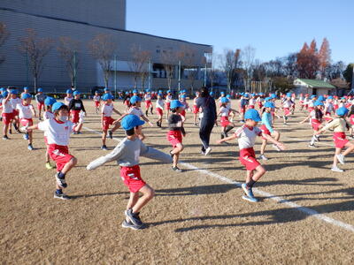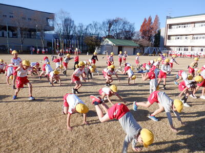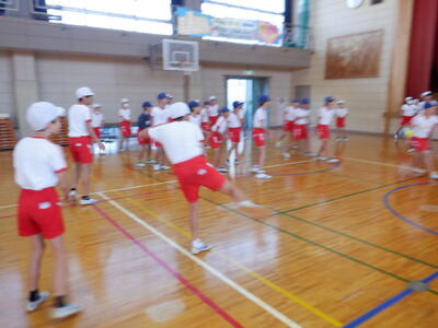 | 1~3年生:ハツラツ体操 1~3年生は「ハツラツ体操」を2回行いました。行進やカエル倒立、カエルの足打ちなど、様々な体の動きに挑戦し、元気いっぱいに頑張る姿が見られました。 |