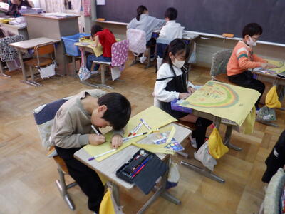 | 2年生は、昨日に続いて不織布バッグの色ぬりの仕上げを行いました。 ほとんど完成していましたが、「もっときれいにしたい」という思いから、どの子も最後まで丁寧に筆を動かしていました。作品に向き合う真剣なまなざしが、とても頼もしく感じられます。 バッグには、学校が大切にしている「結」の文字を書いた子が多く、 運動会の玉入れの場面や、友だちと遊んでいる様子など、子どもたちの思い出が色とりどりに描かれていました。 どの絵にも、その時の笑顔や楽しさがぎゅっと詰まっていて、この一年がどれほど充実していたかが伝わってきます。 仕上がったバッグを手にした子どもたちの表情は、達成感と喜びでいっぱいでした。 心をこめて作り上げた作品が、またひとつ成長の証になりました。 |