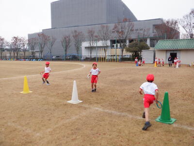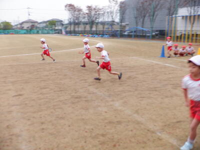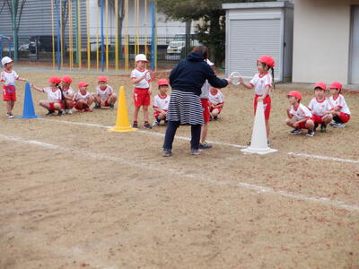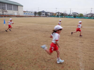 | 1年生の体育では、初めての「折り返しリレー」に取り組みました。まずは先生からルールをしっかりと教わり、リングバトンを渡すときには乱暴にせず、優しく渡すことを学びました。 レースが始まると、子どもたちは全力で折り返しコーンまで走り、次の友だちへリングバトンを丁寧に渡します。走ることが大好きな子どもたちの笑顔があふれ、体育館はとても明るい雰囲気に包まれていました。 初めての折り返しリレーでしたが、ルールを守りながら楽しく活動する姿が印象的でした。これからの体育の学習でも、仲間と協力しながらさらに成長していくことでしょう。 |