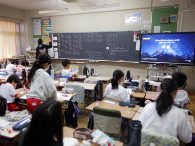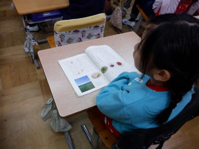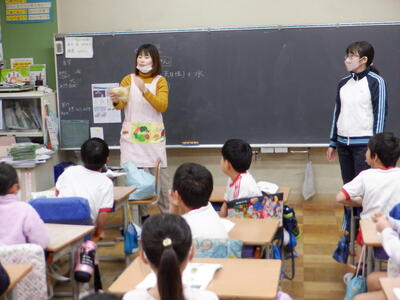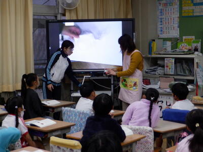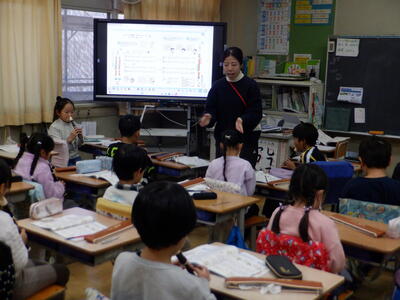 | 3年生の国語では「すがたをかえる大豆」の学習を行いました。 本日は栄養教諭の先生をゲストティーチャーにお迎えし、大豆がどのように姿を変えて私たちの食卓に並ぶのかを教えていただきました。 先生には、実際に昨日買ってきてくださった大豆の加工食品を紹介していただきました。油揚げや厚揚げ、豆腐、味噌など、子どもたちにとって身近な食材がずらりと並びます。子どもたちは「食べたいな~」「その味噌は給食でも使っているの?」など、興味津々でたくさんの声をあげていました。 国語の教科書で学んだ内容が、実際の食材と結びついたことで、子どもたちにとってより深い学びとなったようです。いつもとは少し違う、楽しくておいしそうな国語の授業になりました。 |