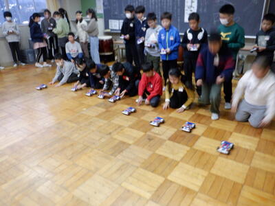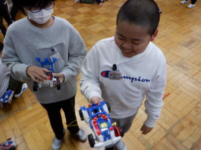 | 5年生の理科では、待ちに待った「電流カー」が完成しました。 完成した電流カーを持って、多目的室に移動し、みんなで10回ものレースを開催!子どもたちは夢中になって電流カーを走らせ、何度もレースに挑戦する姿が見られました。 レースが終わった後も、車軸を少し斜めにして右にカーブさせたり、左に曲げたりと工夫しながら走らせて楽しんでいました。自分の電流カーの動きを試しながら、科学の面白さを体感できたようです。 最後には電流カーを家に持ち帰り、冬休みにも遊びながら学びを深める予定です。子どもたちの笑顔から、学ぶ楽しさがしっかり伝わってきました。 |