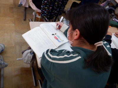 | 4年生の国語では、「友情のかべ新聞」の学習を行いました。 子どもたちはCDによる朗読を静かに聞きながら、心に響いたことをノートにまとめました。内容は「面白いと思ったこと」「登場人物について」「感想」など多岐にわたり、まるで道徳の授業のように一人ひとりが真剣に耳を傾けていました。 書き終えた後には、作品に登場する漢字の意味を調べる活動にも取り組みました。物語の理解を深めるだけでなく、言葉の学びへとつなげることができた時間となりました。 子どもたちの集中した姿勢と、学びを広げていく意欲が感じられる、充実した国語の授業でした。 |