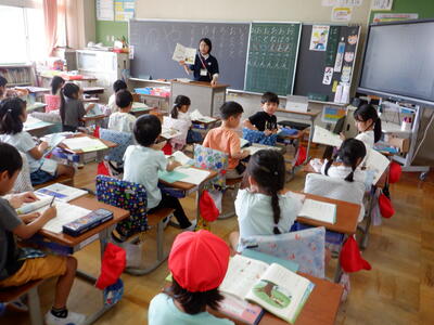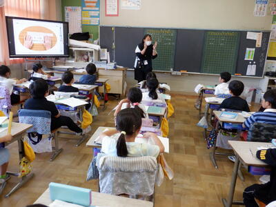 1年生の国語の授業では、「伸ばす言葉」や「へ・え」の使い方について学習しました。たとえば、「おかあさん」や「おにいちゃん」のように、「あ」や「い」で音を伸ばす言葉を丁寧に確認しました。 また、「こうえんへ行く」のような文を通して、「へ」と「え」は同じ音でも使い方が違うことも学びました。言葉のしくみや音の違いに気づくことで、表現力がぐんと広がりますね。 子どもたちは発見の連続に目を輝かせながら、一つひとつの言葉にじっくり向き合っていました。 |