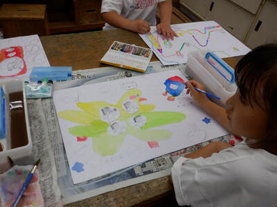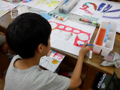 3年生の図工の授業では、「不思議な乗り物」をテーマに創作活動に取り組みました。子どもたちは、「ロケット」や「クラゲ」など、自由な発想でユニークな乗り物を考え、それぞれのストーリーが詰まった世界を画用紙の上に表現してくれました。 作品はどれも色づかいが鮮やかでカラフル!まるでファンタジーの世界に入り込んだような楽しい気持ちになります。子どもたちの豊かな想像力と表現力に、思わず笑顔になる作品ばかりでした。 |