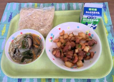 5月25日(木) ごはん 牛乳 カレイのレモン風味 大豆の磯煮 新じゃがの味噌汁 新じゃがは、皮が手でむけるくらい薄く、皮もおいしく食べられます。そして、みずみずしい食感が特徴です。今日はお味噌汁にして、おかずは、和食メニューとなっています。 |