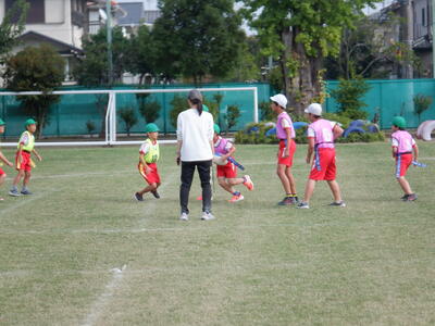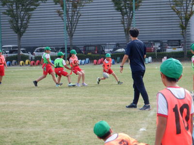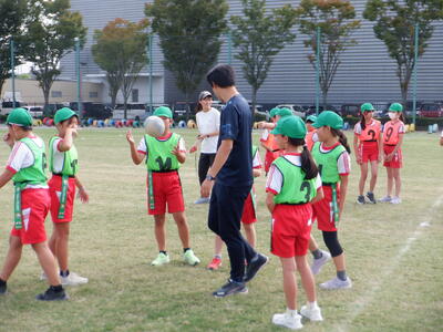 5年生の体育では、3クラス対抗のタグラグビー大会が行われました! クラス対抗の試合は、やっぱり盛り上がりますね。芝生のグラウンドをしっかりと踏みしめながら、ラグビーボールを手に全力で走る子どもたちの姿は、とても頼もしく感じられました。 「タグを取るぞ!」「負けないぞ!」という気持ちが伝わってくるようなプレーの数々。仲間と声をかけ合いながら、楽しそうに取り組む様子が印象的でした。 試合が終わった後の子どもたちの顔には、達成感と充実感があふれていました。勝ち負けだけでなく、全力で挑んだことが大きな学びとなったようです。 |