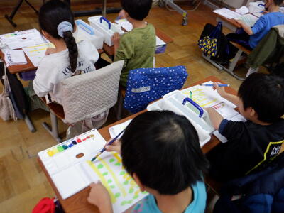 | 1年生は図工の時間に「えのぐあそび」の学習をしました。今日のめあては「えのぐをつかって、いろいろためしてみよう」です。 子どもたちは、いろいろな色を使って四角や点を描いたり、筆を使ってさまざまな技法に挑戦しました。えのぐ活動にわくわくしながら、思い思いの表現を楽しんでいました。 「うまくできた!」「もっとやってみたい!」と笑顔いっぱいの声があがり、図工の楽しさを存分に味わうことができたようです。これからの学習でも、子どもたちの豊かな発想が広がっていくのが楽しみです。 |