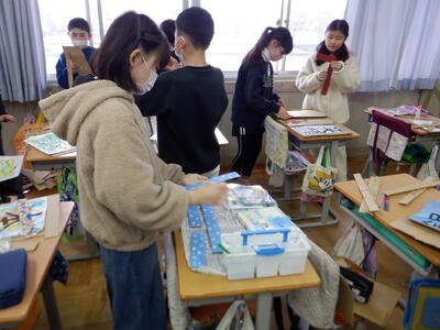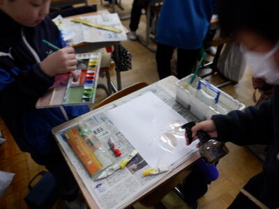 | 5年生の書写では、図工の授業と組み合わせて、子どもたちが書いた文字をより素敵に見せる額縁づくりに取り組んでいます。 書いた文字のまわりには、一人ひとりが思い描いたデザインを丁寧に描き込み、世界に一つだけの作品へと仕上げていきました。 筆や霧吹きを使って色をにじませると、半紙がふわっと鮮やかに変化し、子どもたちの表情も思わずほころびます。額縁もダンボールを使い、手を動かしながら「ここはこうしたらもっと素敵になるかな」と工夫を重ねる姿が見られました。 作品には、子どもたちの集中するまなざしや、完成を楽しみにする気持ちがたっぷり詰まっています。教室には、心が温かくなるような素晴らしい作品が少しずつ形になり始めています。 |