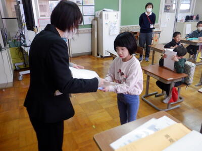 | 各学年では、子どもたちに「通知表」が手渡されました。 担任の先生は、一人ひとりの名前を呼びながら、そっと目を合わせ、温かいメッセージを添えて通知表を渡していました。 子どもと先生が並んで通知表を開き、この一年で頑張っていたこと、できるようになったこと、そして来年度に向けて期待していることを、丁寧に伝える姿はとても心に残るものでした。 通知表を受け取った子どもたちは、どの子も嬉しそうな表情を浮かべていました。 「こんなに頑張ったんだ」「来年もがんばろう」 そんな気持ちが自然とあふれているようで、満足そうに通知表を見つめる姿は、まるで小さな宝物を手にしたようでした。 一年間の努力が形となって手元に届くこの瞬間は、子どもたちにとって大きな自信になります。 そして、その成長をそばで見守ってこられた保護者の皆さまにとっても、きっと胸が温かくなるひとときだったのではないでしょうか。 新しい学年でも、子どもたちが自分らしく輝きながら、また一歩ずつ成長していけることを願っています。 |