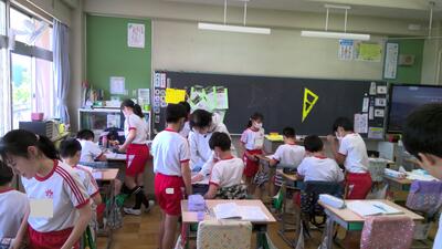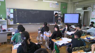 6年生の算数「図形」の授業では、線対称・点対称の図形について学習しています。なかなか難しくなってきて、とてもやりがいのある領域の学習です。大型提示装置を活用し視覚的な理解を促したり、友だちどうしので学び合いの場を意図的に設定したりしながら、理解をより深めています。