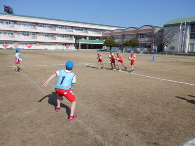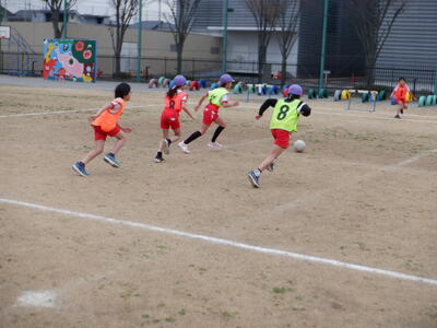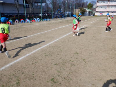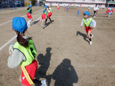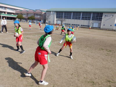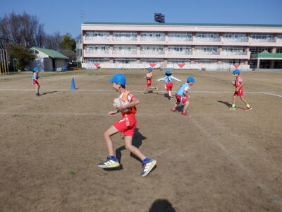 | 3年生の体育では、「タグラグビー」に取り組みました。 今日はラグビーボールを持ってのドリブルを中心に練習し、相手の動きを見ながら守るディフェンスにも挑戦しました。 ボールを追いかける子どもたちの姿はとても真剣で、仲間と声をかけ合いながら楽しそうに動き回っていました。 お天気にも恵まれ、あたたかな陽ざしの中で体を思いきり動かすことができ、子どもたちは本当に気持ちよさそうでした。 走るたびに笑顔が広がり、友だちと一緒に運動する喜びがあふれていました。 今日の青空のように、子どもたちの心ものびのびと輝いていた時間でした。 |