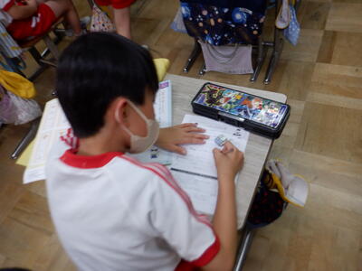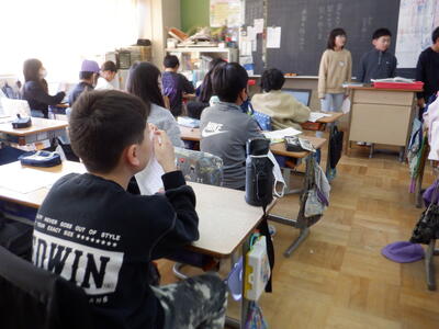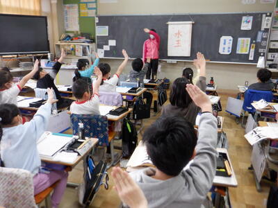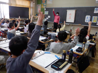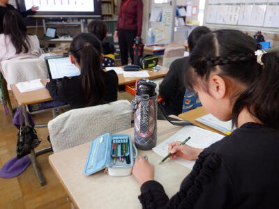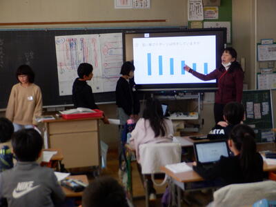 4年生の国語では、「調べて話そう、生活調査隊」の学習を進めています。 電子黒板を使って発表するため、 担任の先生からは、