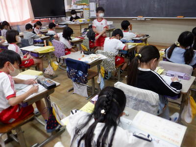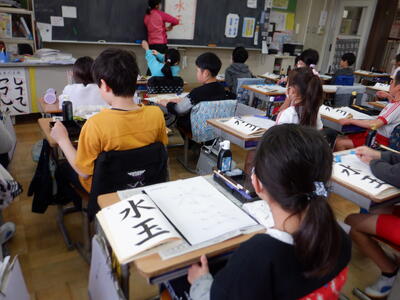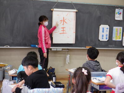 | 3年生の書写では、「水玉」という漢字に挑戦しました。授業のはじめ、子どもたちは手をまっすぐ伸ばし、空中で大きく筆を動かしながら「書き順」「ハネ」「はらい」を一つひとつ確認していきました。その真剣な表情からは、「上手に書きたい」という気持ちがしっかり伝わってきました。 お手本を墨で丁寧になぞったあと、いよいよ半紙へ。筆先にそっと気持ちを込めて、一画一画を大切に書く姿は、とても頼もしく、見ているこちらまで背筋が伸びるようでした。 今日が3年生としての最後の習字の時間でしたが、どの子もこれまでの積み重ねを生かし、とても立派な「水玉」の字を書くことができました。書き終えたあとに見せてくれた満足そうな笑顔には、この一年の成長がぎゅっと詰まっているようでした。 4年生では、また新しい学びが待っています。子どもたちがさらに大きく羽ばたいていく姿が楽しみです。 |