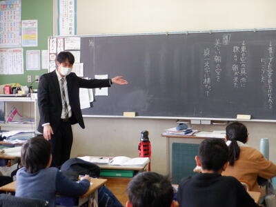 | 5年生の国語では、「大造じいさんとガン」の学習を進めています。今日は、物語の中でも特に印象深い「残雪」の様子や行動について、みんなで丁寧に読み取りを行いました。 担任の先生が黒板に「美しい朝の空を真一文字に横切って」と書くと、子どもたちはすぐにプリントへ書き写し、物語の情景を思い浮かべながら真剣に学習に向かっていました。その姿はとても落ち着いていて、物語の世界にぐっと入り込んでいることが伝わってきました。 「大造じいさんとガン」は、長く読み継がれてきた名作です。だからこそ、子どもたちが登場人物の思いに寄り添いながら読み進めている姿を見ると、心の中に確かな成長が積み重なっていることを感じます。 物語を通して、感じたことや考えたことが、これからの子どもたちの心を豊かにしてくれることでしょう。 |