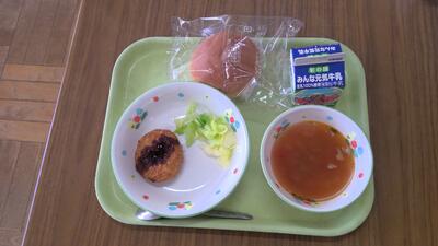 今日の給食は、こどもパンスライス、牛乳、ボイルキャベツ、エビカツ、ミネストローネです。