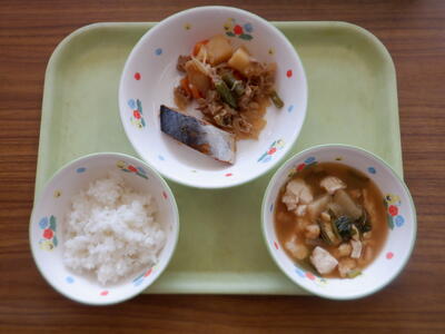 今日の給食は、ごはん、牛乳、さばの照り焼き、肉じゃが、利久汁です。