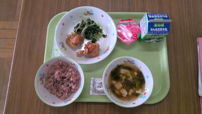 今日の給食は、赤飯、牛乳、鶏の唐揚げ、ほうれん草のお浸し、豆腐のみそ汁、セレクトデザートです。
