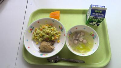 今日の給食は、カレーピラフ、牛乳、鶏肉のレモンバジル焼き、ベジタブルスープ、清見オレンジです。