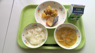 | 今日の給食は、さわらのすだち醤油焼き、肉じゃが、かぶの味噌汁、ごはん、牛乳です。 |