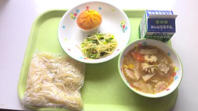 今日の給食は、ホット中華麺、チャンポン麺のスープ、もやしときゅうりのナムル、キャロットカップケーキ、牛乳です。