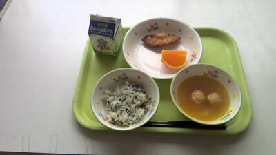 今日の給食は、わかめ菜めし、たらの甘酒フライ、ちゃんこ汁、清見オレンジ、牛乳です。